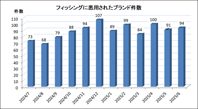 また、悪用された「ブランド件数」は前月より3ブランド増えて94件でした。内訳はクレジット・信販系20ブランド、証券系13ブランド、金融(銀行)系11ブランド、通信事業者・メールサービス系9ブランド、配送系6ブランド、EC系6ブランド、オンラインサービス系6ブランドでした。前月に続いて証券系は新しいブランドが増えています。