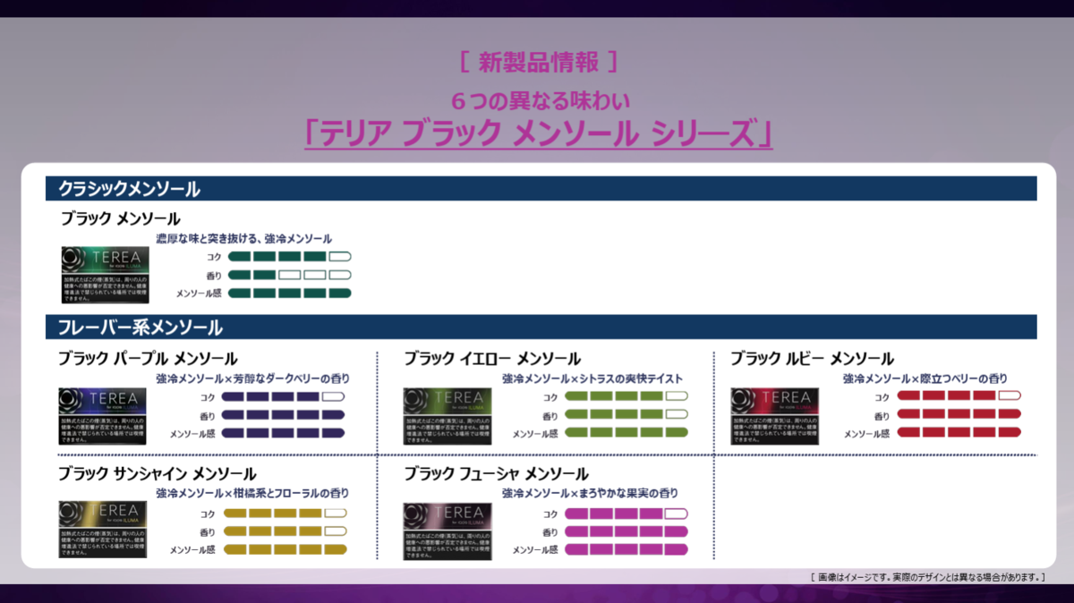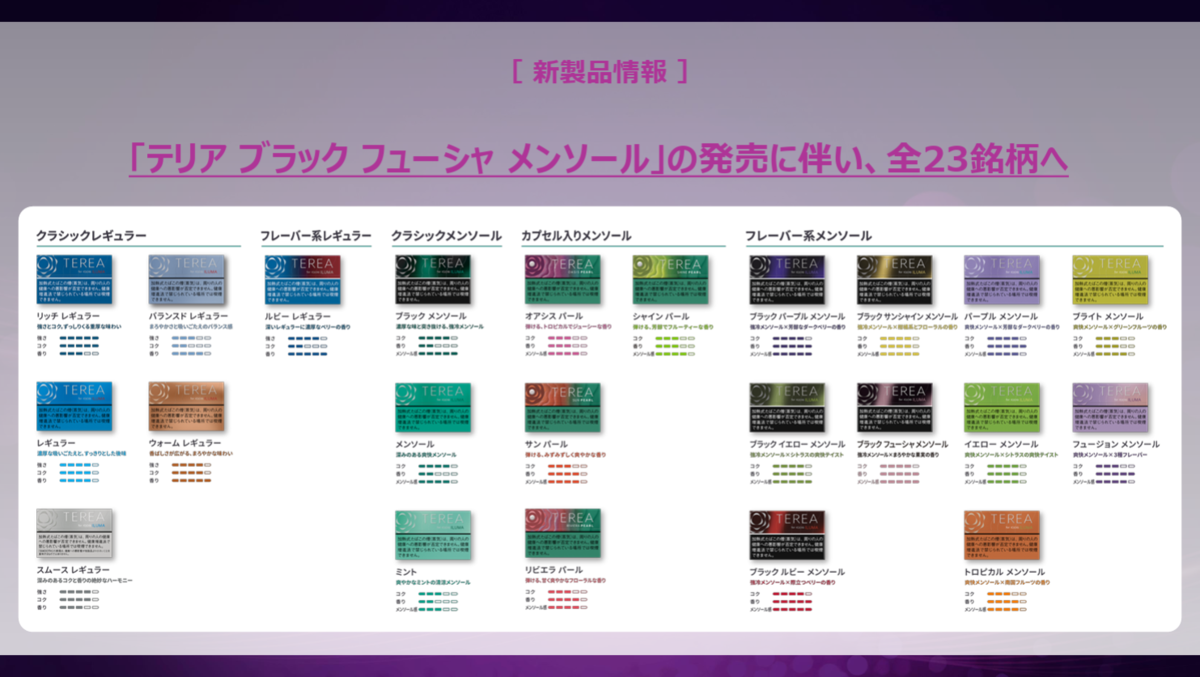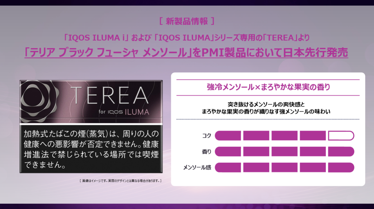 フィリップ モリス ジャパン合同会社は7月22日、加熱式たばこ「IQOS ILUMA i(イルマ アイ)」「 IQOS ILUMA(イルマ)」専用タバコスティック「TEREA(テリア)」の新銘柄として「テリア ブラック フューシャ メンソール」を発表した。価格は580円。