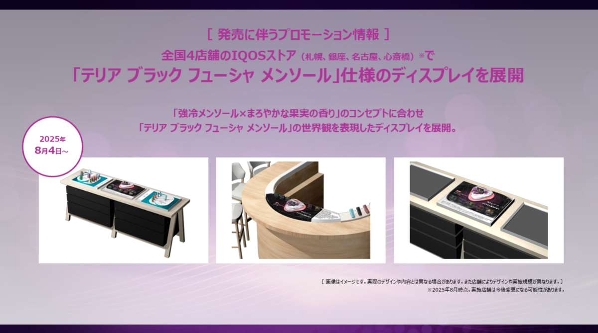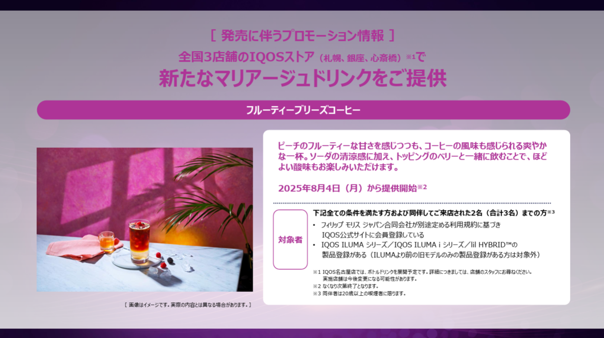 また発売を記念して、全国4店舗のIQOSストア(札幌、銀座、名古屋、心斎橋)でテリア ブラック フューシャ メンソール仕様のディスプレイを展開。加えて、条件を満たすIQOSユーザーと同伴者2名(合計3名)を対象に、8月4日から名古屋を除く3店舗では新たなマリアージュドリンク「フルーティーブリーズコーヒー」を提供する。