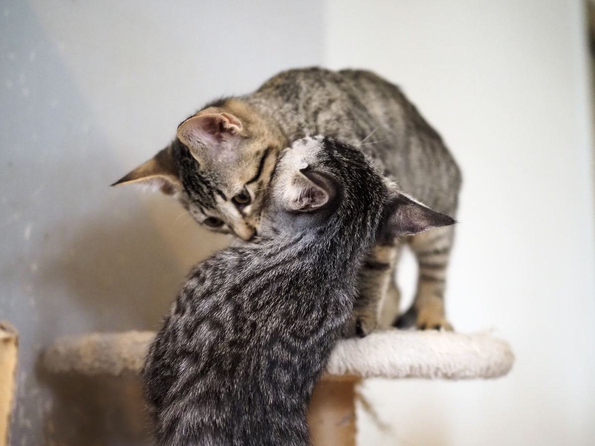 ここからは冷房が効いた「保護猫シェルターqueue」へ。実は新人子猫の「キャベツ」と「レタス」のキジトラ兄弟の傍若無人っぷりがすごかったのである。ほかの猫は寝たりちょっと高い位置に逃げたりしてる中、この2匹だけが暑さもものともせず、ところ狭しとじゃれ合いながら走り回っているのだ。