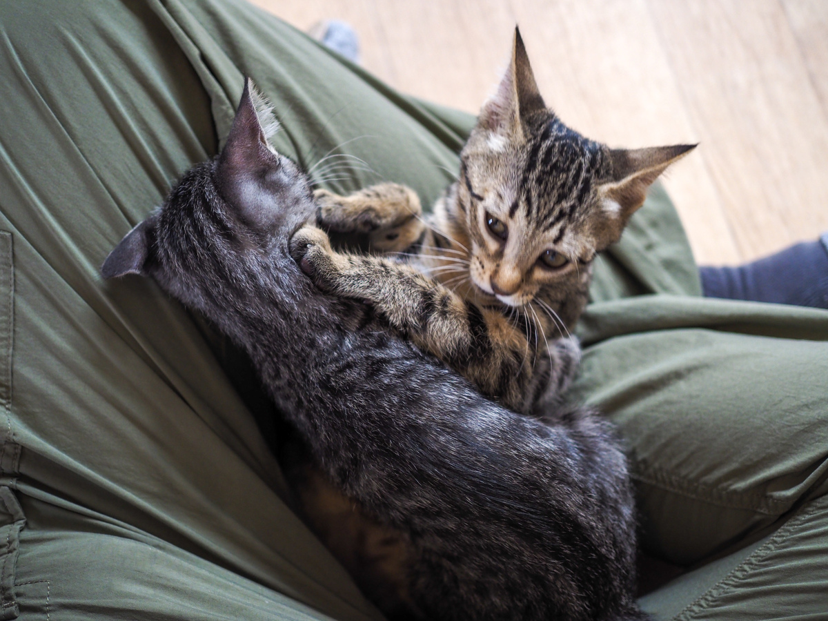 このまま落ち着くかと思いきや、もう1匹がだまっちゃいない。膝の上で2匹の子猫プロレスが始まったのである。