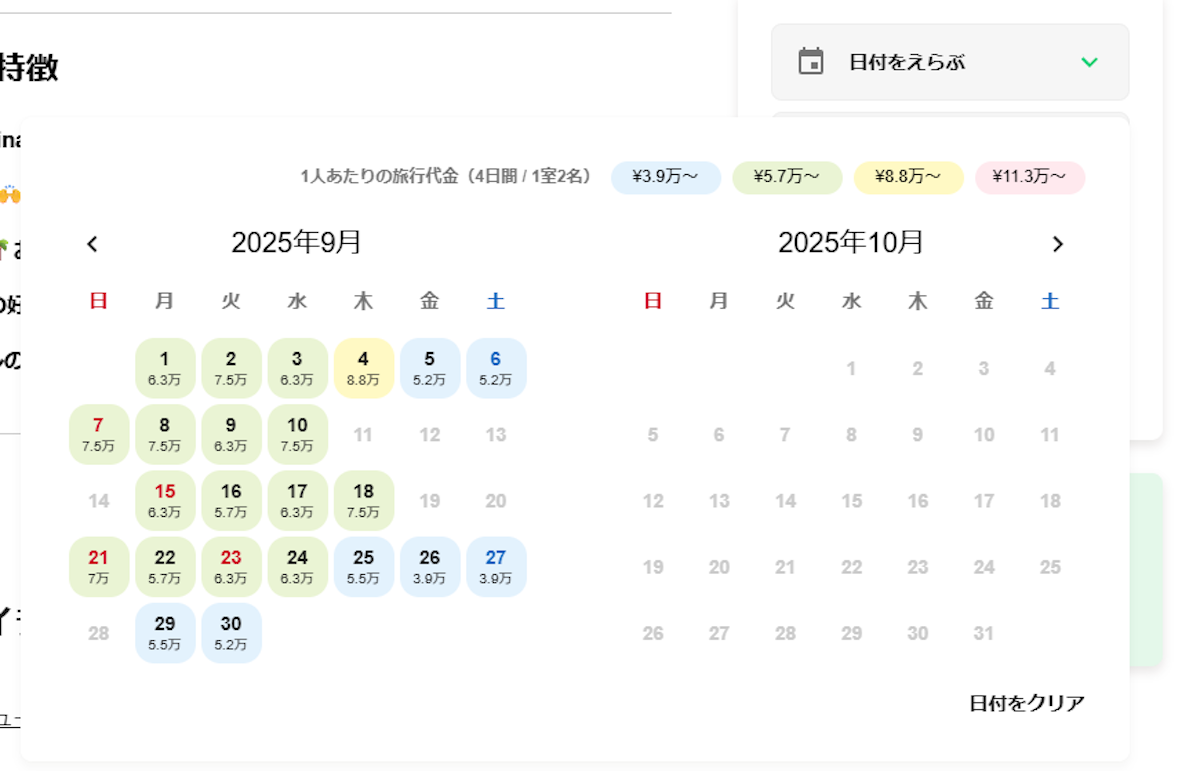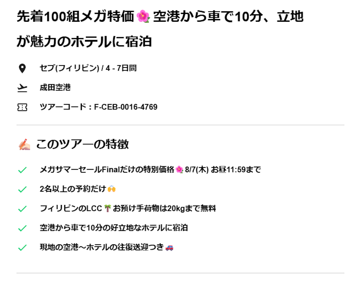 週替わりセールもあり、狙い目は成田発着のフィリピン・セブ/3泊4日(2名1室)のツアー! 残念ながら8月は10万円を超えるものの、9月は旅行代金が3万9800円で利用できる日が残っており、諸税などと合わせてもひとり4万6760円と非常にお得です。