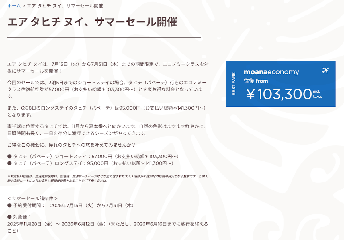 航空会社もサマーセールを実施中です。なかでも注目なのは、南太平洋の楽園「タヒチ」へ成田から直行便を運航している「エア タヒチ ヌイ」。7月31日までエコノミークラスを対象にサマーセールを開催しています。