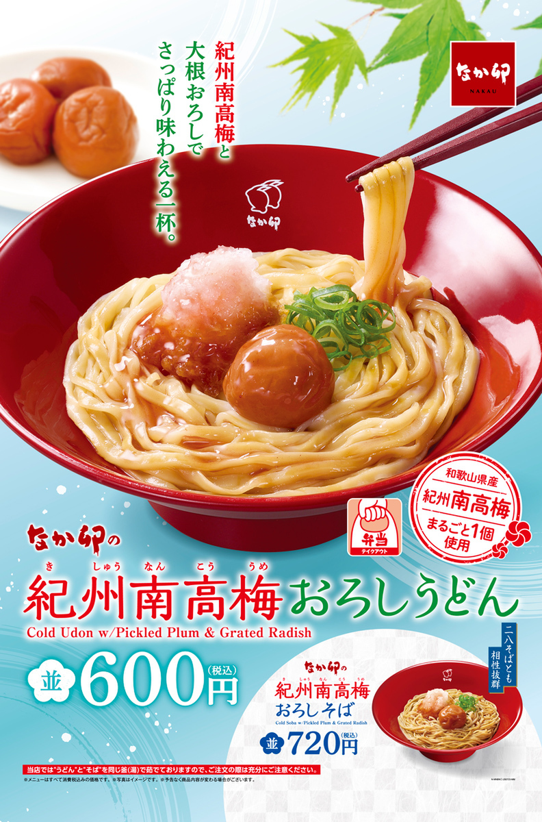 果肉のやわらかさとやさしい甘み、そして程よい酸味が特徴の梅干しを中心に、紀州南高梅入りの特製梅だれとなか卯のしょうゆだれを合わせた味わいが、細切りうどんと大根おろしに絡むとしています。