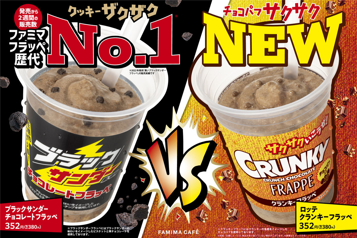 ファミリーマートのフラッぺと「クランキー」とのコラボは今回が初めて。ファミマとしては史上初、“人気のお菓子対抗バトル”として異なるメーカーのコラボフラッペが並ぶこととなります。・ファミマ史上初!“ブラックサンダーvsクランキー”フラッペ2種が同時登場!