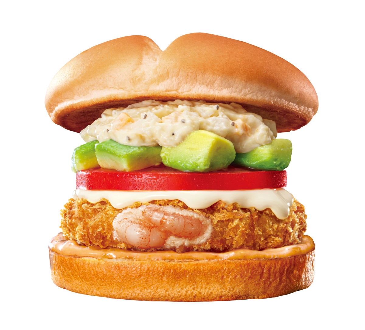 人気商品の「エビバーガー」をハワイ風にアレンジした「ハワイアンアボカドエビバーガー」は、エビパティにアボカドとトマトを組み合わせ、タルタルソースとチーズソースをふっくらしたバンズで包んでいます。