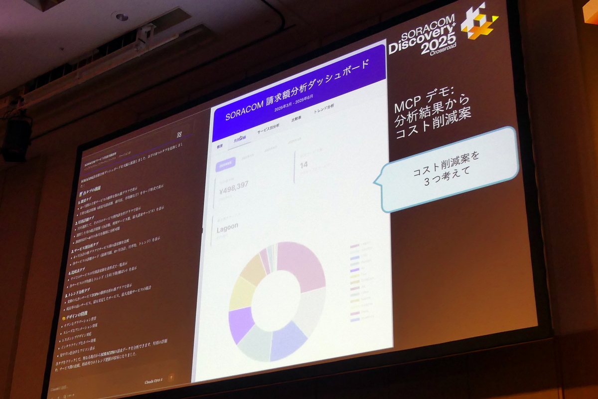 また、MCPサーバーの提供により、SORACOM APIをAIエージェントから呼び出し、自然言語で処理や可視化を扱えるようになる。安川氏は、ソラコムの課金トップ5をグラフを表示させるだけではなく、コスト削減案まで考えてもらえるというやや自虐的なデモまで披露した。