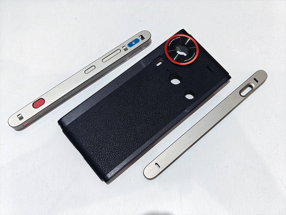 するとどうでしょう! 見た目がクラシカルなカメラフォンへと変形します。ここでポイントなのは、上下にアタッチメントを取り付けたことで、本体の縦の幅が広がること。より幅広な本体になったことで、外観はカメラらしさが増すわけです。