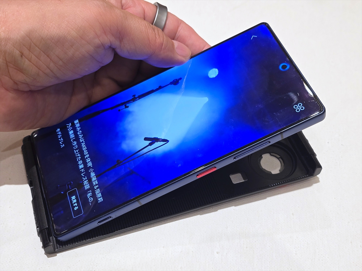 そしてここからさらに、nubia Z70 Ultraシリーズをカメラに変形させることができるのです。上部アタッチメントの上に、もう1つのボタンなどのあるアタッチメントを重ねて取り付けることができます。