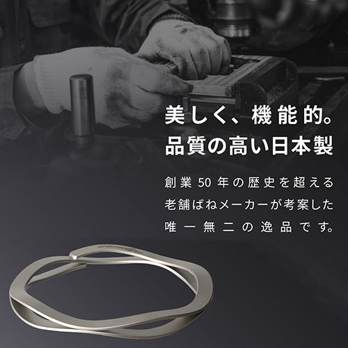 ヘタレないマネークリップ最先端技術を支える波形状の特殊なバネのメカニズムによって、これまでの二つ折りバネの弱点を克服しました。リングサイズはスモール50mm、ラージ60mmの2種類をご用意し、お札やカードをスムーズに差し込めます。