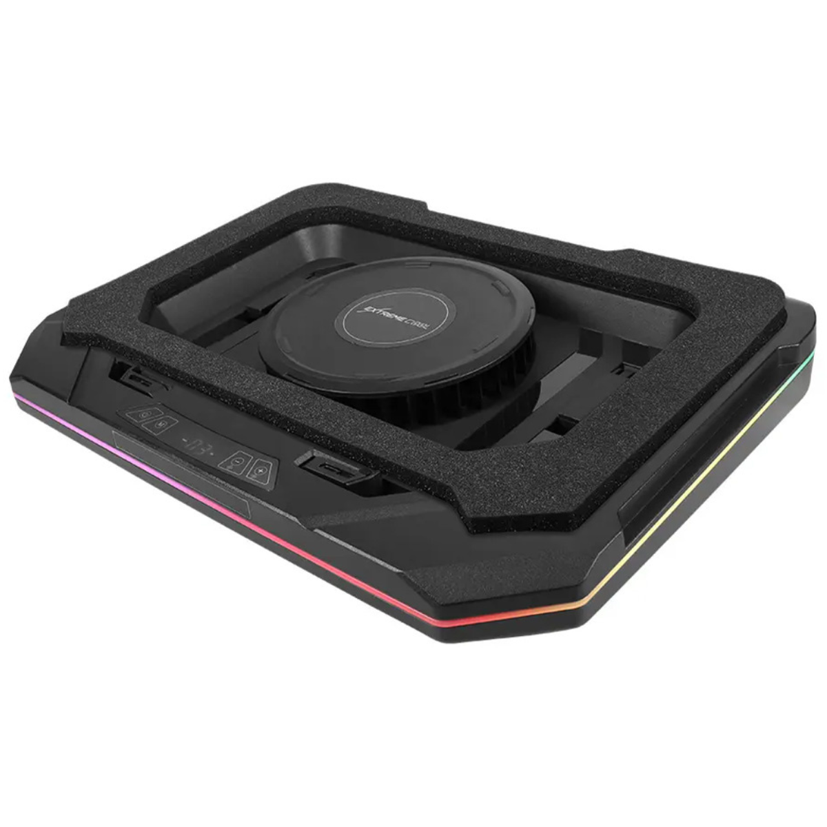 「ドローン?」と思った人も多いはず。「OWL-GNC-RGB2」はノ直径98mmと直径70mmの大小計6基のファンで全体の熱を効率よく冷却するノートPC用のスタンド型クーラー。特にハイスペックで発熱量が大きいゲーミングノートPCユーザーなら是非とも導入したい逸品です。本体下部にファン風量と動作パターンが確認できる液晶ディスプレイを搭載。ファン速度は6段階で調整できるほか、手前側と奥側のファンで動作パターンを切り替えることで、ノートPCの排熱口に合わせて冷却できます。