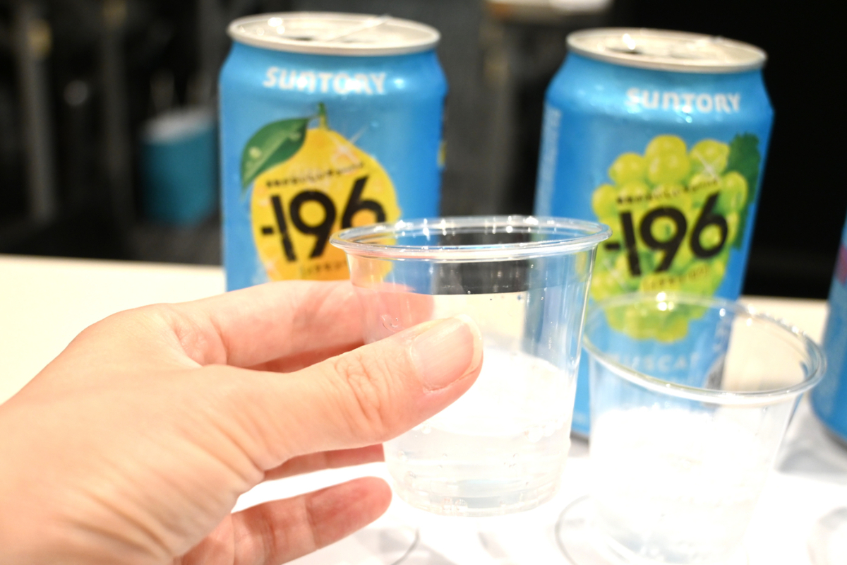 発表会では、「-196」のレモン、シャインマスカット、白桃の3つのフレーバーを試飲できました。