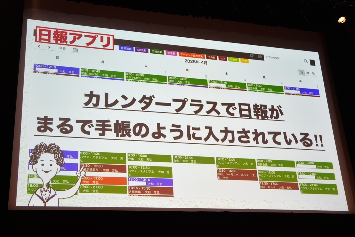 そして傳農氏は、kintoneアプリの開発に着手。初めて作成したのは、定番の「日報アプリ」だ。しかし、社員からは「面倒」と言われ、ほとんど使ってもらえなかった。そこで、YouTubeで再度学び、理解を深めたのがkintoneをより便利にする「プラグイン」である。高山とも相談を重ねながら日報アプリをブラッシュアップ。「カレンダーPlus」のプラグインを導入して、手帳のように直感的に入力できるアプリへと進化させた。ただそれでも社員の定着には至らなかった。