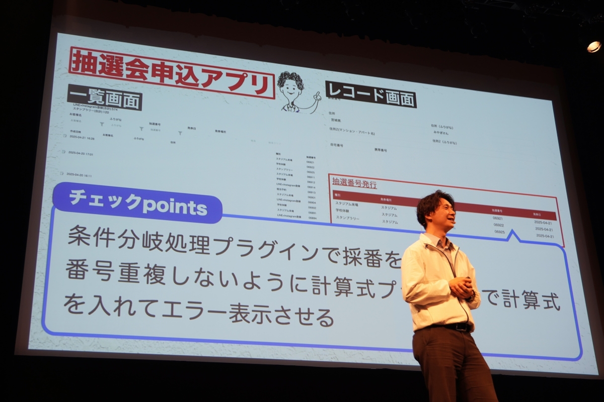 アプリでは、顧客用ページをつくり、埋め込んだテーブルに「条件分岐処理プラグイン」で採番(一意の識別番号を割り当てること)。一覧画面は「テーブルデータ一括表示プラグイン」によって一目で抽選番号が分かるようにするなど、工夫を凝らした。