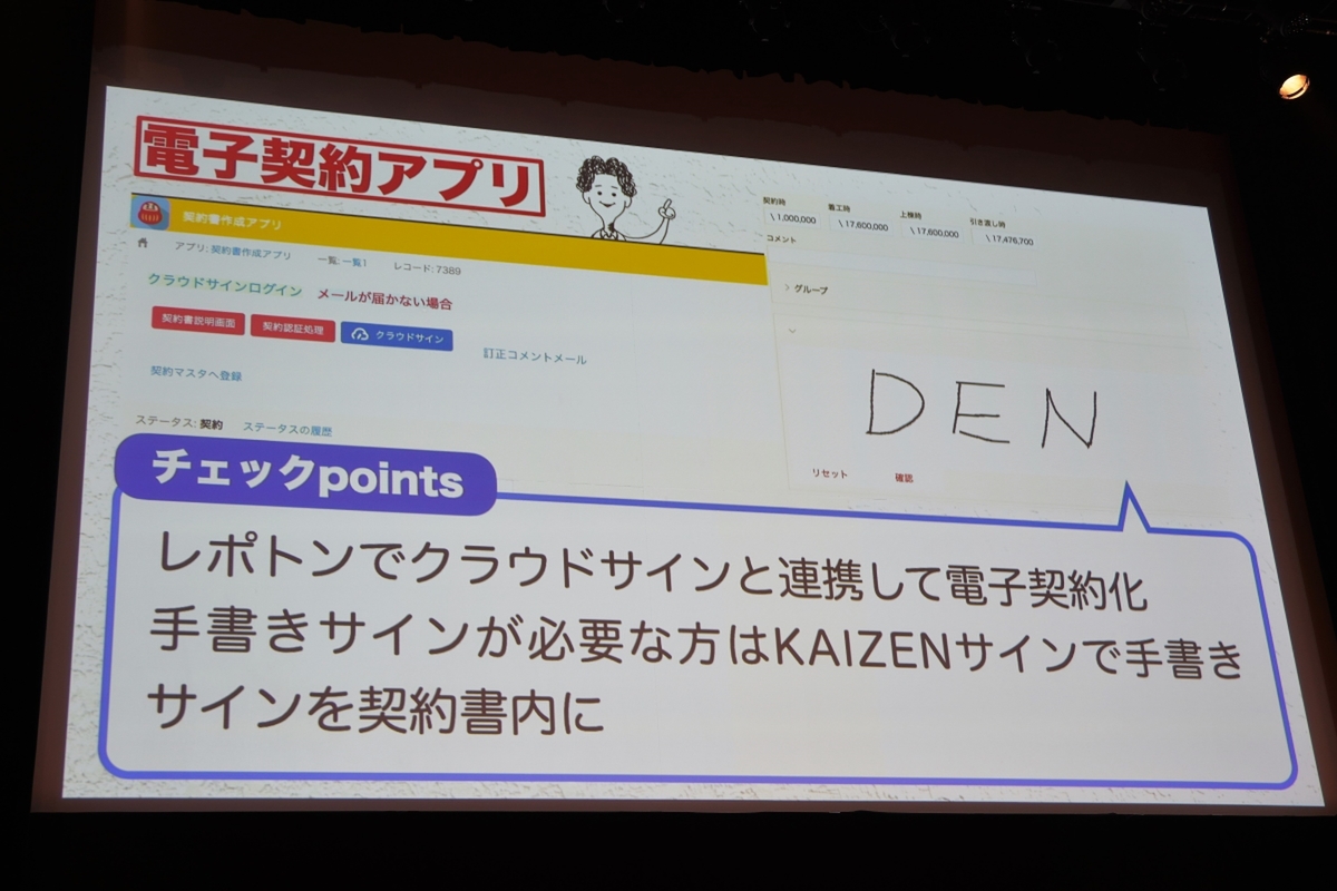 さらに大きな成果を生んだのが、「電子契約アプリ」だ。「レポトン」のプラグインで電子契約サービスのクラウドサインと連携させ、「KAIZEN SIGN」のプラグインで手書き署名にも対応。業務削減効果は絶大で、年間200万円の印紙代が不要になり、契約書の手書きなどの作業も約3か月で2000時間も削減できている。
