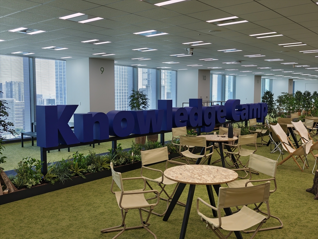 オフィス内の壁を極力取り払い、オープンな空間とすることで、偶発的な出会いを促進します。また、社員同士のマッチング施策も用意され、部門を超えたコラボレーションを促します。Knowledge Campと呼ばれる社員なら誰でもフリースペースでは、他部署やパートナー企業の人たちとたまたま出会って、雑談レベルからコラボレーションに繋がることを期待しているとか。