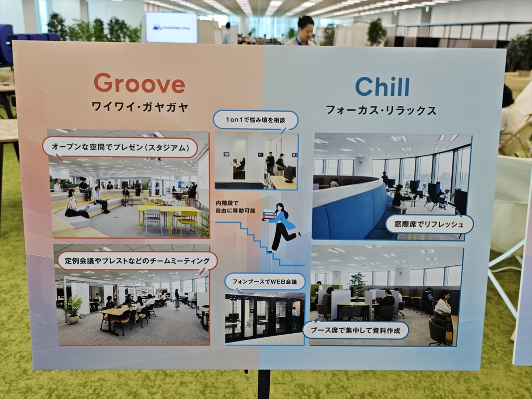 その一環として、ABW(Activity Based Working)と呼ばれる、活発な議論を促す「グルーブな空間」と、深く思考に没頭できる「チルな空間」を使い分ける働き方を導入し、社員の創造性を高めます。