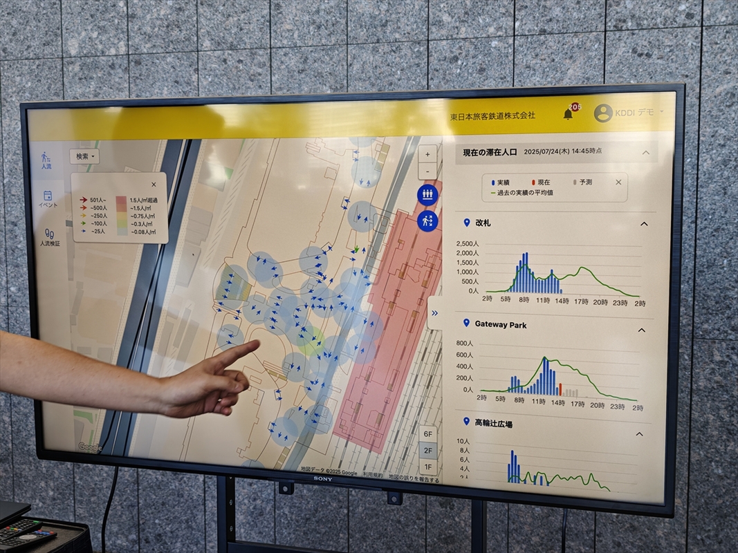 この未来の都市を実現するため、KDDIは「デジタルツインプラットフォーム」を構築しました。これは「TAKANAWA GATEWAY URBAN OS(都市OS)」と呼ばれ、街の防犯カメラ映像、各種センサー、顧客データ、鉄道データなど多岐にわたる情報をリアルタイムで収集・分析し、サイバー空間で活用することで、現実の街づくりにフィードバックする仕組みです。