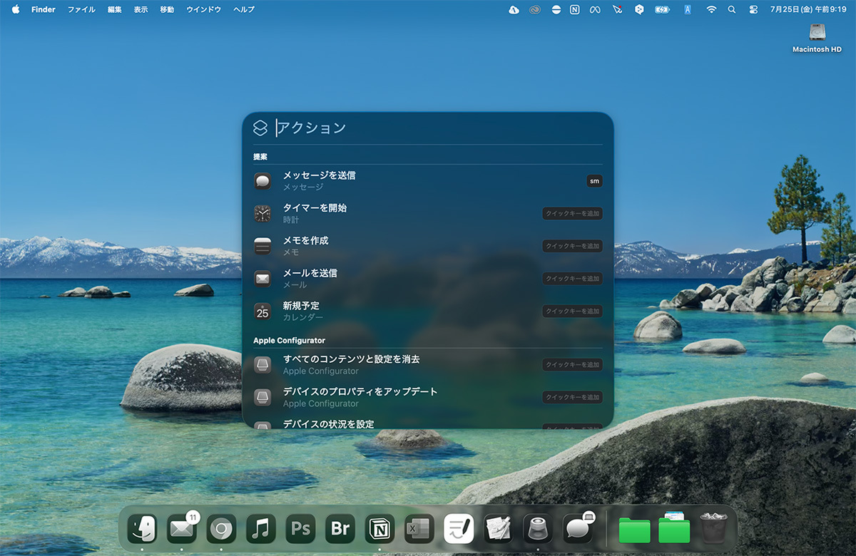 macOS TahoeではSpotlightが大きくアップデートします。アプリやファイルの検索が整理されたリストを俯瞰しながら行えるので、目的に直結したブラウジングができます。Spotlightに新設される「アクション」の機能を使うと、例えばメッセージやメールのアプリを立ち上げなくても、Spotlightから宛先を指定して簡易な連絡が素速くできます。よく使うアクションを「クイックキー」に登録するとスムーズにたどり着けます。
