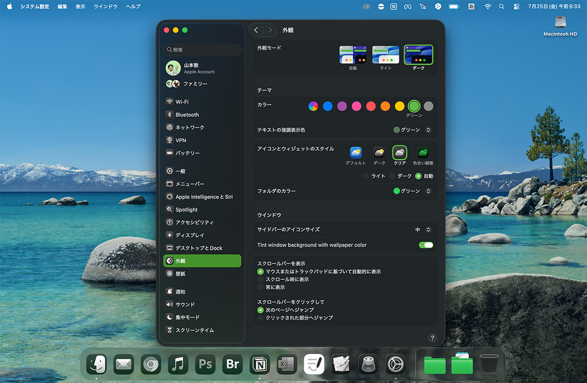 まずLiquid Glassデザインの第一印象ですが、iOSやiPadOSよりもmacOSとの方が相性が良いと感じます。macOS Tahoeでは、macOSとして初めて「外観」の設定からアイコンとウィジェットのスタイルを「デフォルト(ライト)」「ダーク」「クリア」「色合い調整」から選べるようになります。フォルダの色変更も可能です。