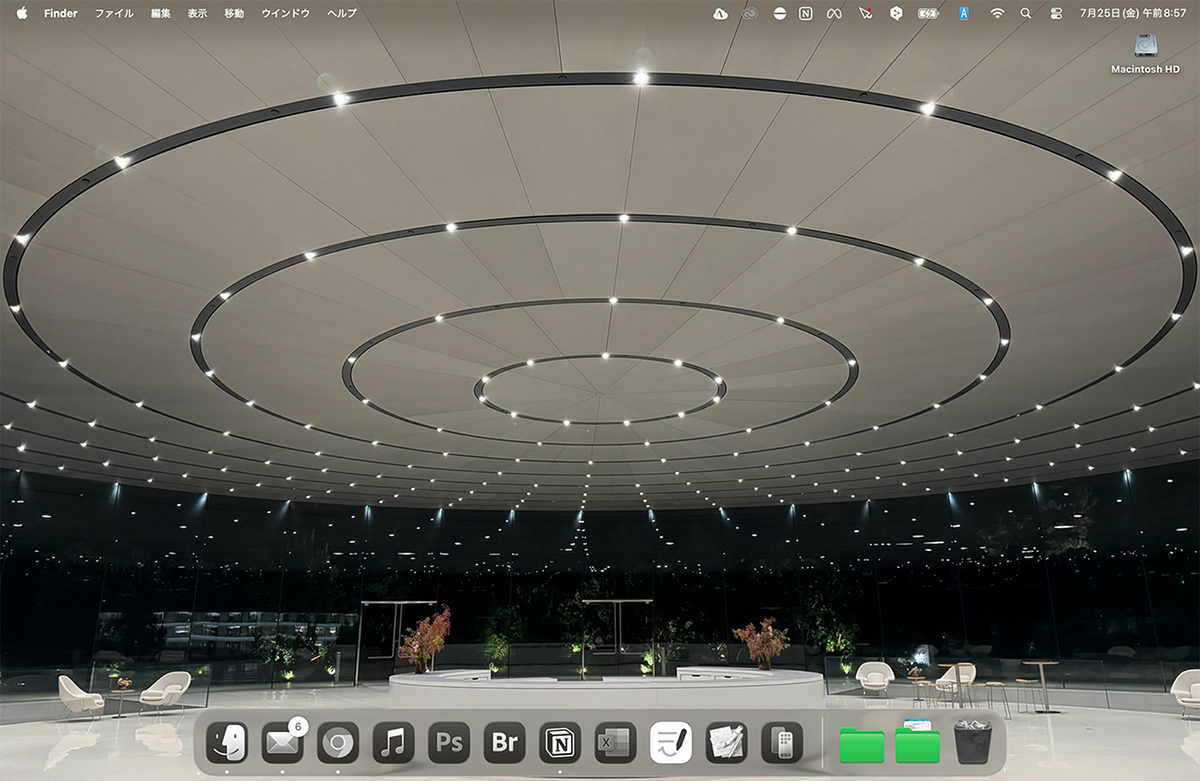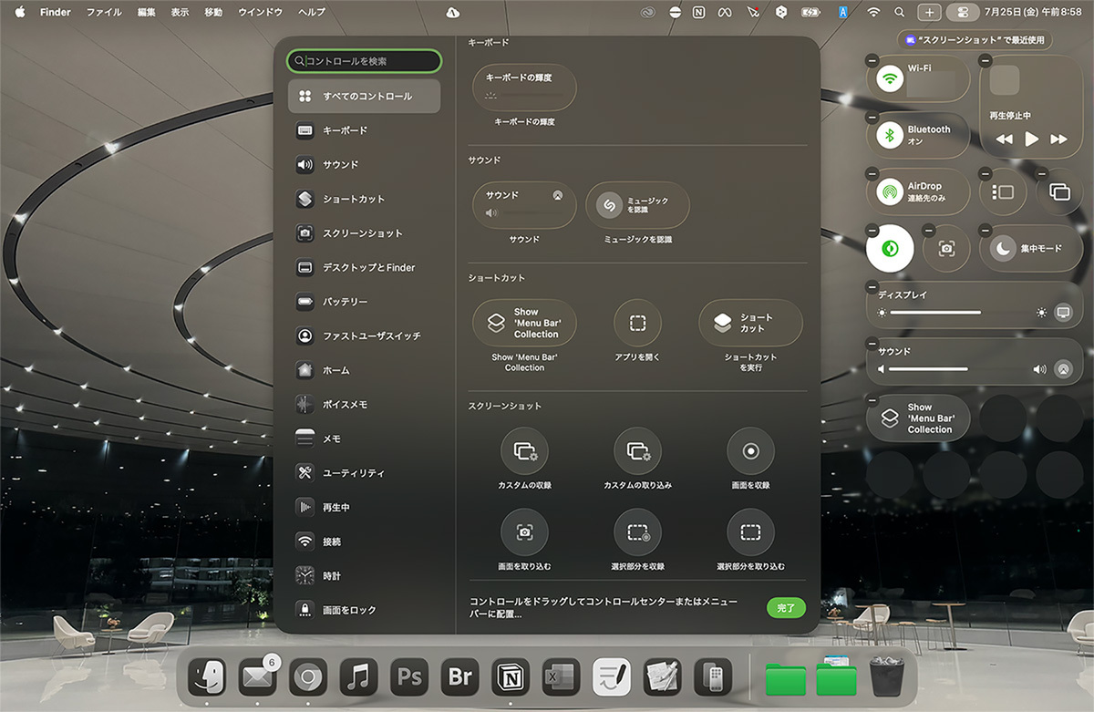 Liquid Glassデザインによりコントロールセンターやトップのメニューバーが透過表示になったことで、コントロールセンターに重なるウィンドウとの間に立体感が生まれ、壁紙に選んだイメージが広々と表示されます。結果、Macの画面により深く没入しながらタスクに集中できる感覚があります。