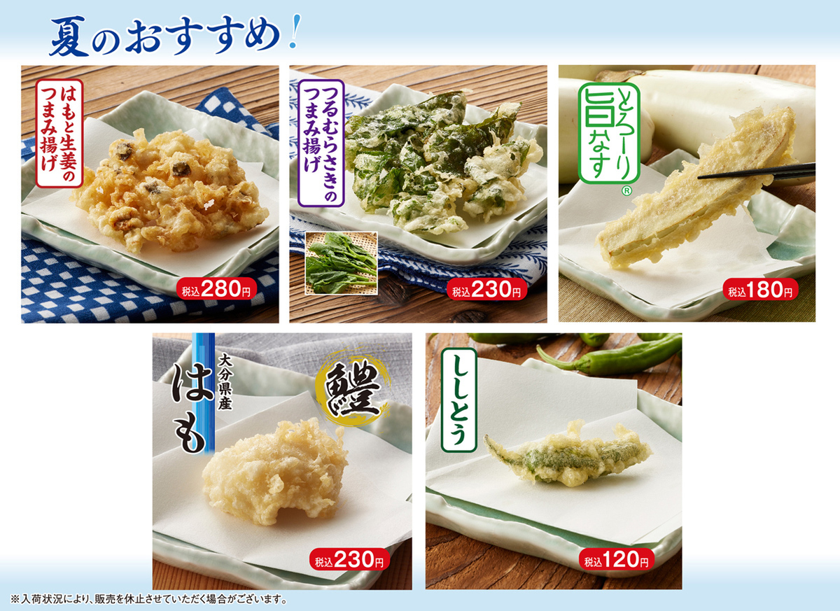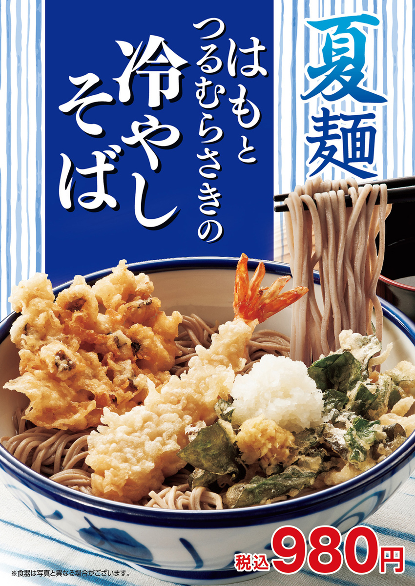 「はもとつるむらさきの冷やしそば」は、上品な味わいとふっくらとした食感が魅力のはもに生姜をあわせた「はもと生姜のつまみ揚げ」を主役に、夏が旬の野菜「つるむらさき」のつまみ揚げ、さらに定番の海老天をトッピング。香りとコシのバランスが良い「藪そば」を使用し、さっぱりと食べられる冷やしそばに仕上げたとのこと。