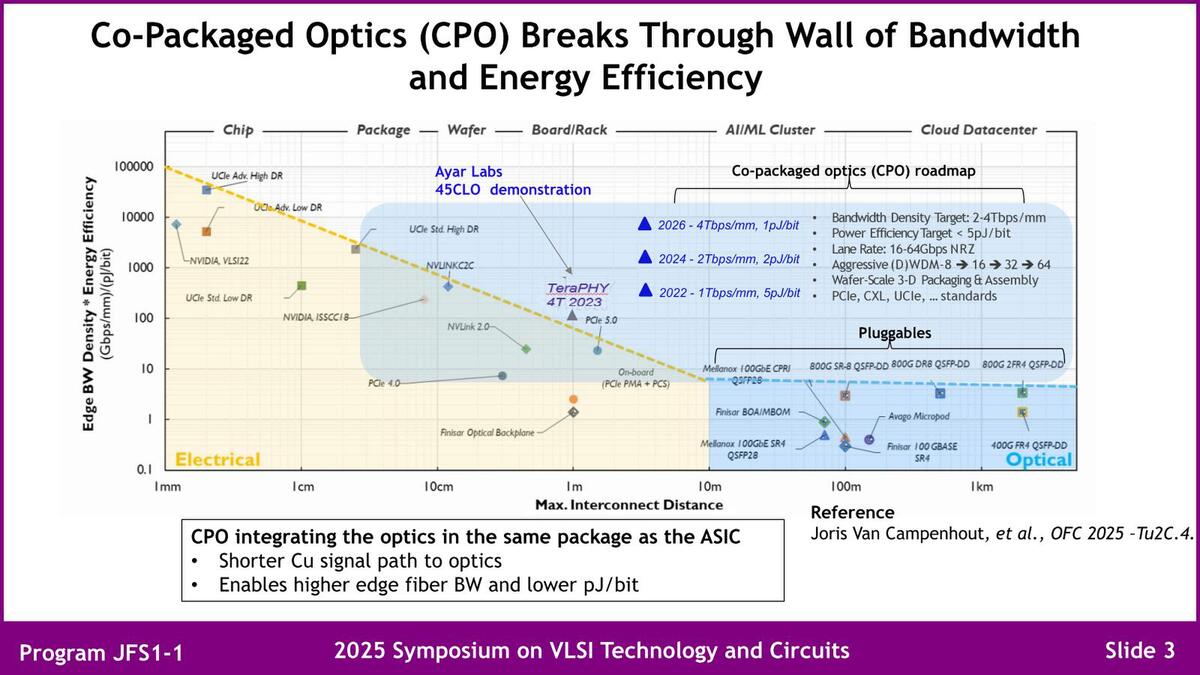 さて、CPOとはなにか? というGFの回答が下にある「OpticsをASIC内のパッケージに収めること」であり、この結果として銅配線(=電気配線)の長さを最小にでき、より高い帯域を低い消費電力で実現できる、としている。このあたりは他のメーカーも大体同じなのだが、右上にあるロードマップがおもしろい。