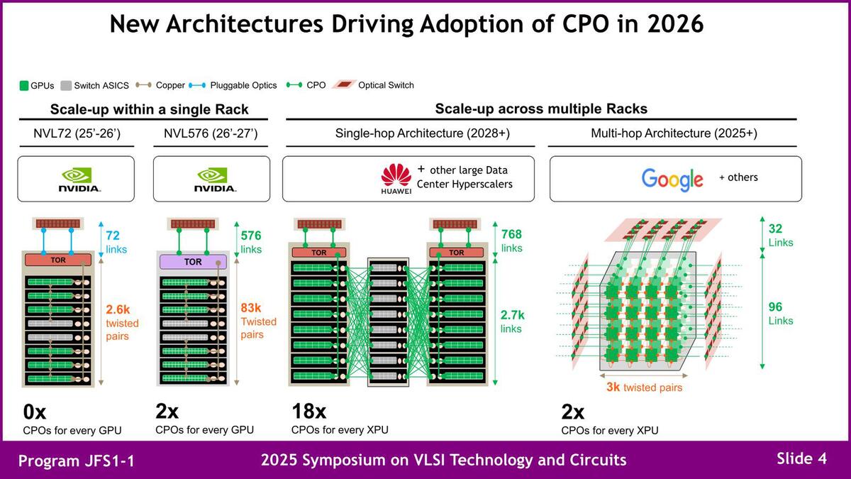 そのCPOについて、すでに公表されているCPOを利用したシステムというのが下の画像だ。NVIDIAは今年発売予定のSpectrum-XでCPOを採用することをすでに発表済であり、またGoogleも2023年の時点でネットワークが光化されていることは連載729回で説明したが、この先にCPOを使うことがほぼ確実視されている。