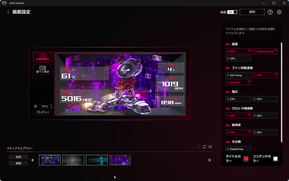 デフォルトで選べる表示映像のプリセットは4種類で、その映像を背景にCPU、GPUの温度やファン回転数などのシステム情報を、手軽に表示できる。
