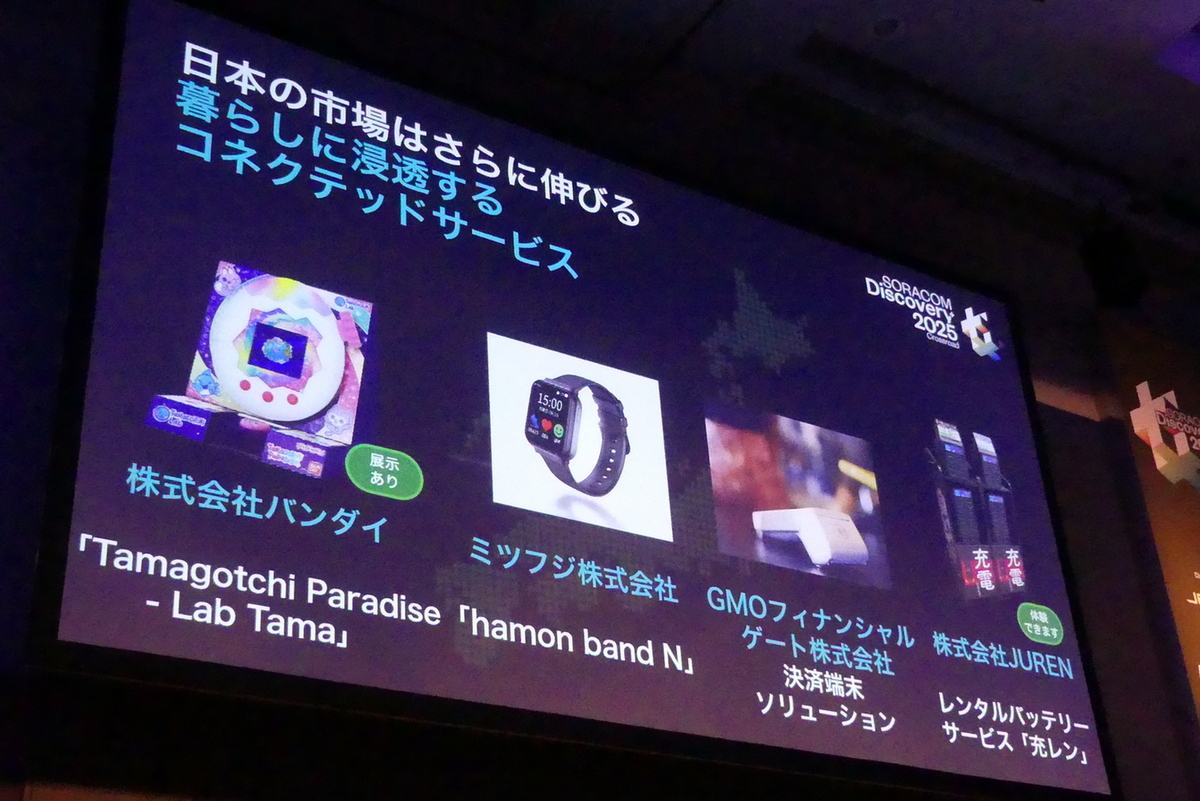また、われわれの生活を支えるコネクテッドサービスでも採用が相次いでいる。たとえば、バンダイはグローバルに設置されているたまごっちの店舗用端末「Tamagotchi Paradise - Lab Tama」にSORACOMを採用し、コンテンツやアップデートなどの配信を行なっている。また、ミツフジは生体情報を取得し、熱射病リスクなどをを警告するスマートウォッチ「hamon band N」にSORACOMのeSIMを搭載。その他、GMOフィナンシャルグループの決済端末やJURENのレンタルバッテリーサービス「充レン」にもSORACOMが採用され、遠隔のオペレーションやメンテナンスにも活用している。