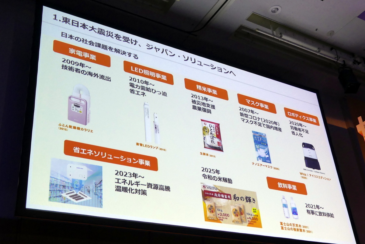 さて、アイリスオーヤマが「日本の社会課題を解決する」というジャパン・ソリューションに大きく舵を切ったのは、東日本大震災がきっかけだ。2009年から始まった家電事業も、もともとは技術者の海外流出という課題から生まれたもの。2010年に立ち上げたLED照明事業は電力需要がひっ迫した震災後に大きくフォーカスされるようになり、2013年からは被災地復興のために精米事業を始めている。「令和の米騒動のときは、なんでアイリスオーヤマが米売ってるの?と言われましたが、実は2013年から精米事業は始めていました」とのことだ。