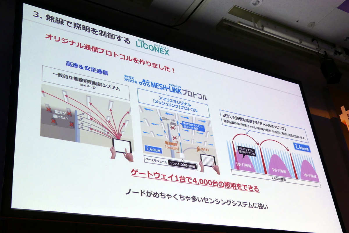これに対してアイリスオーヤマではプロトコルを自ら作ってしまった。具体的には、照明同士でデータをリレーするメッシュリンクのプロトコルで、2.4GHz帯で安定した通信を実現するチャネルホッピングなどを独自実装している。「今では1台のゲートウェイで4000台の照明を制御できる」という。