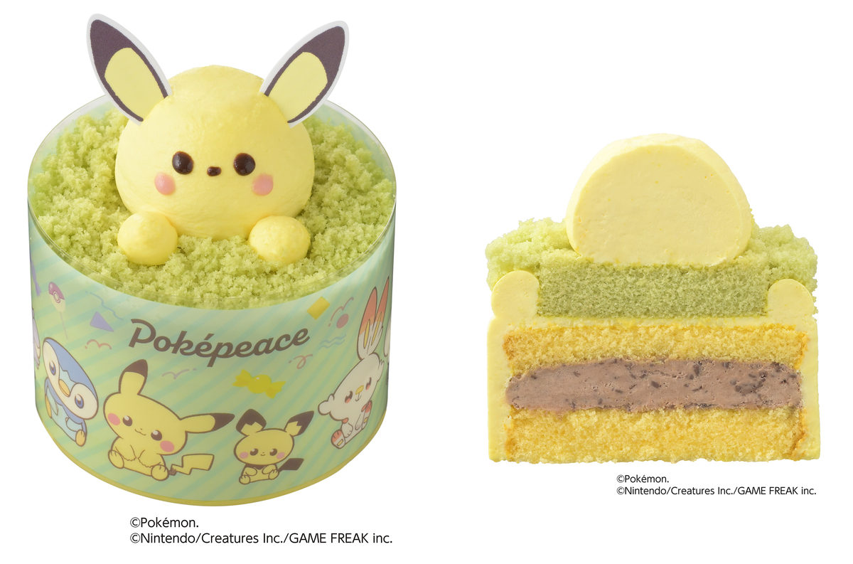 「<ポケピース>ピカチュウのチョコバナナケーキ」はポケピースのピカチュウにフォーカスしたおひとりさまサイズのケーキで、ふわふわのバナナスポンジでチョコクリームをサンドし、バナナクリームで仕上げたピカチュウのまわりにはふわふわの抹茶スポンジクラムを散らしている。