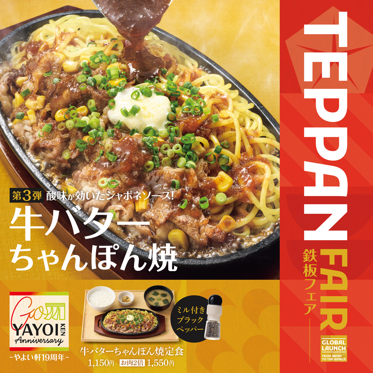 やよい軒は「TEPPAN FAIR(鉄板フェア)」第3弾として、8月5日より「牛バターちゃんぽん焼定食」と「【お肉2倍】牛バターちゃんぽん焼定食」を全国の店舗で発売します。