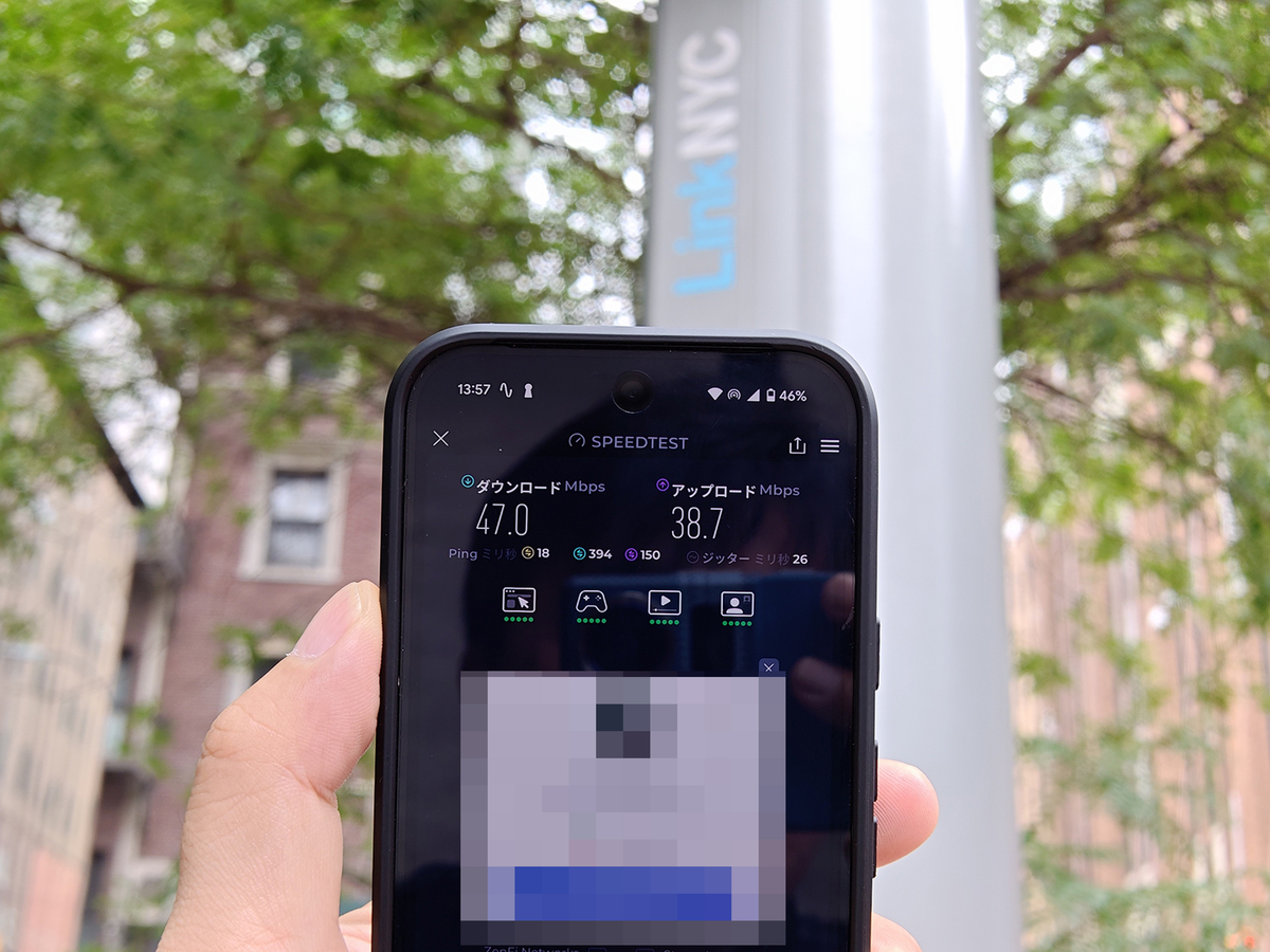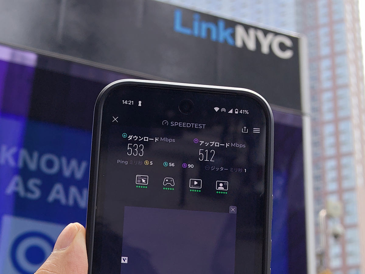 速度は下りが50Mbps弱、上りが40Mbps弱。5G回線ですがホットスポット利用ということもあり一定の速度に抑えているのかもしれません。光回線のLinkNYCと比べると低速ですが、それでも遅い回線のカフェやホテルより快適でしょう。そして何よりも重要なのは、料金が無料なことです。