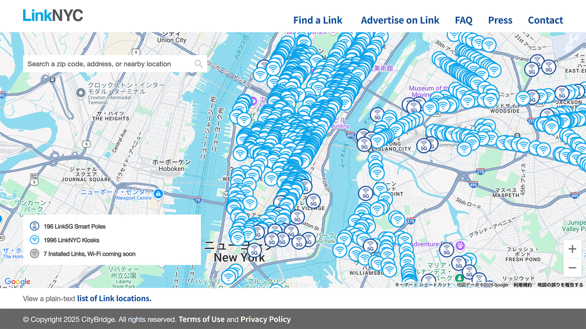 それから約10年、今や5Gも普及し誰もが高速通信を自分のスマートフォンで享受できる時代になりました。とはいえ、いろいろな事情でまだまだ公的な通信手段を必要とする人は多くいます。外国からの観光客にとっても、ローミングサービスが充実していないエリアもまだまだあります。LinkNYCは5G時代に寂れることもなく、逆に今でもエリアを増やしているのです。設置場所は以下のリンクから見ることができます(LinkNYC検索サイト)。