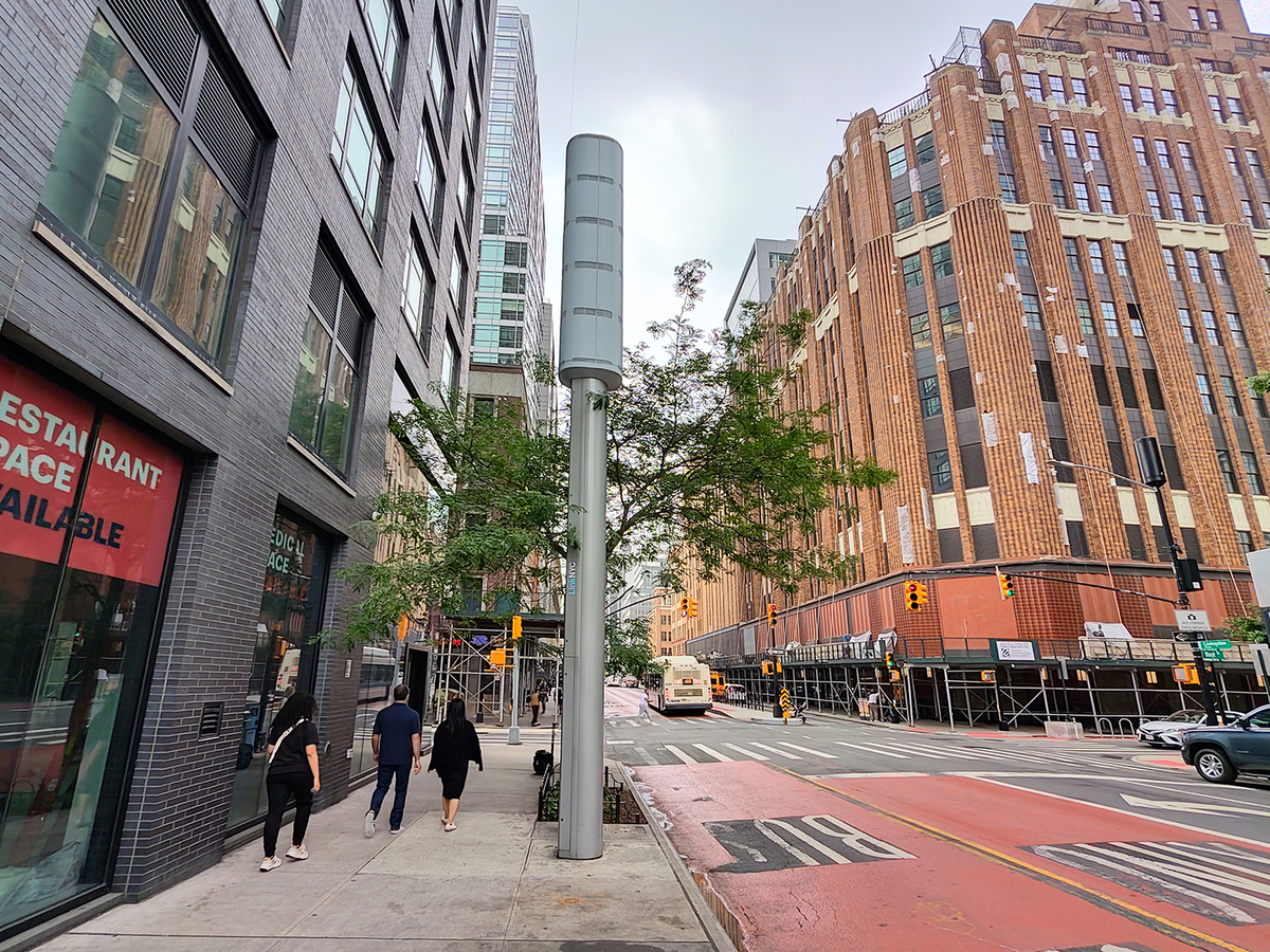 そこで新たに登場したのが「LinkNYC 5G」です。これはデジタルサイネージや光回線がない、スマートポールと呼ばれる電柱型の端末。内部に5Gモデムを内蔵しており、電源と小さな面積があれば設置できます。これまでLinkNYCを設置できなかった場所にも高速回線を無料で提供できるようになるのです。