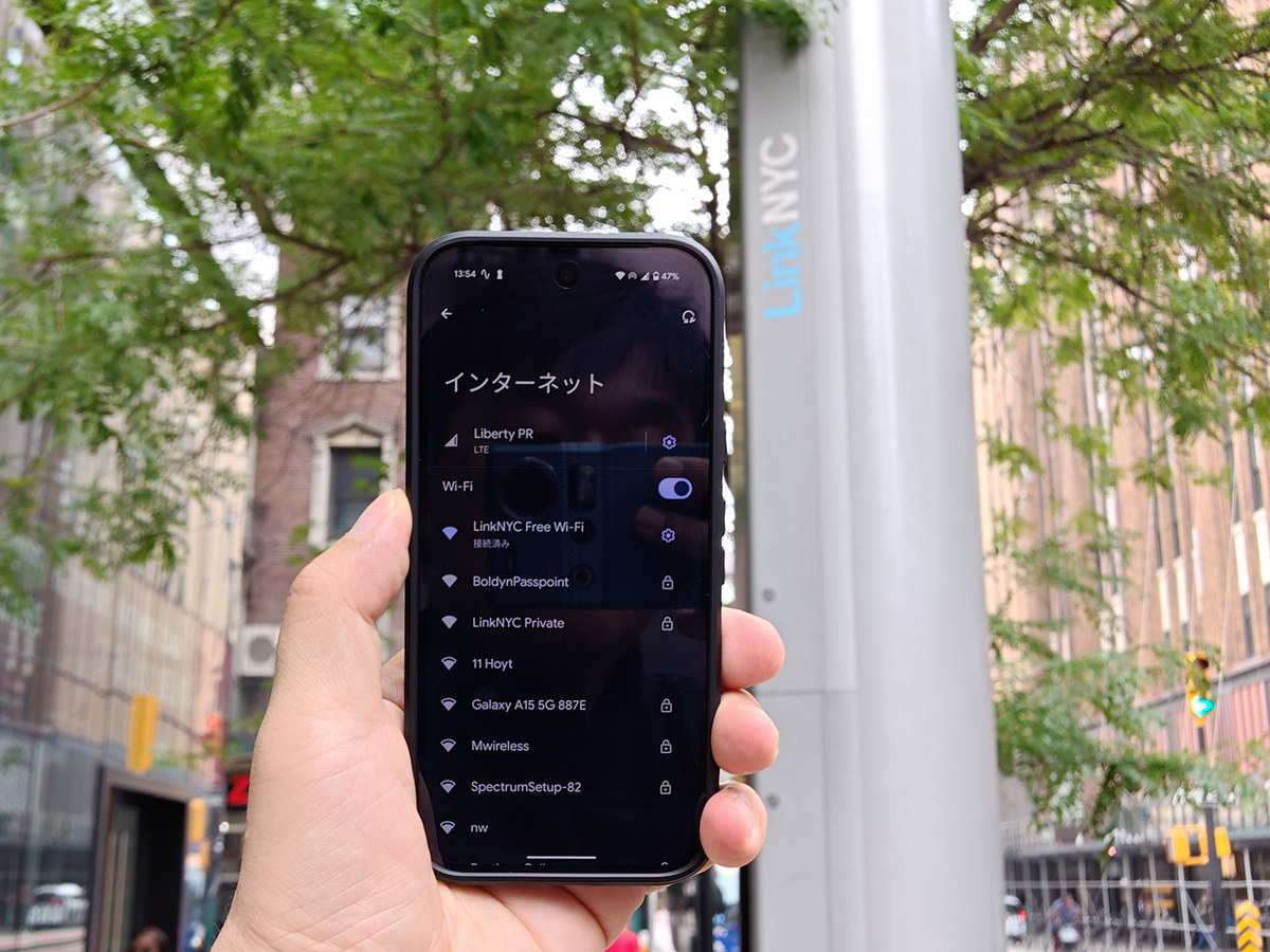 実際に使ってみました。LinkNYC 5Gのそばに行くと「LinkNYC Free Wi-Fi」というWi-Fiが飛んでいます。Wi-FiそのものはLinkNYCと同じSSDで使えます。また、一度どこかのLinkNYCでログインしていれば自動でつながります。