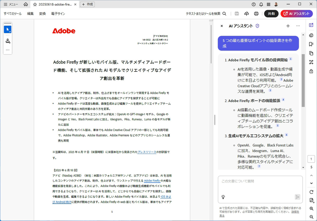 ここでは、AdobeのプレスリリースのPDFを読み込ませてみた。「5つの最も重要なポイントの箇条書きを作成」というプロンプトを選んだところ、少し考えたあと、5つの要点をきっちり教えてくれた。それぞれの項目には引用箇所がリンクされているのでファクトチェックするのも簡単だ。基本的にPDFの中身から回答を生成するので、ハルシネーション(幻覚)を起こす可能性が低いのも特徴だ。