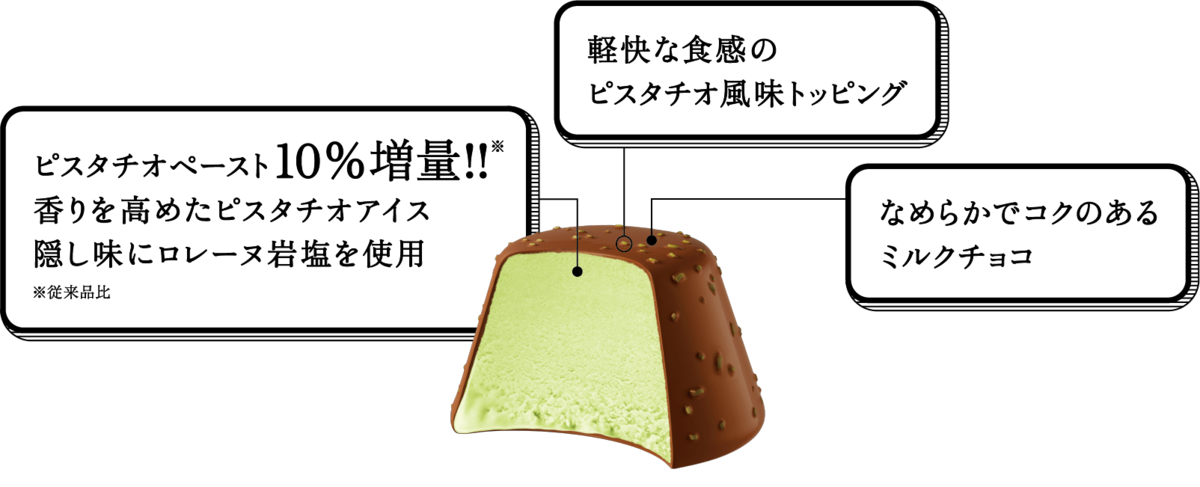 「ピノ ピスタチオ」は香り高いピスタチオアイスを、ピスタチオ風味のトッピングを混ぜ込んだミルクチョコでコーティングしたひとくちアイス。ピスタチオとチョコの絶妙なバランスがひとつぶで味わえ、満足感の高いおいしさを特徴としている。