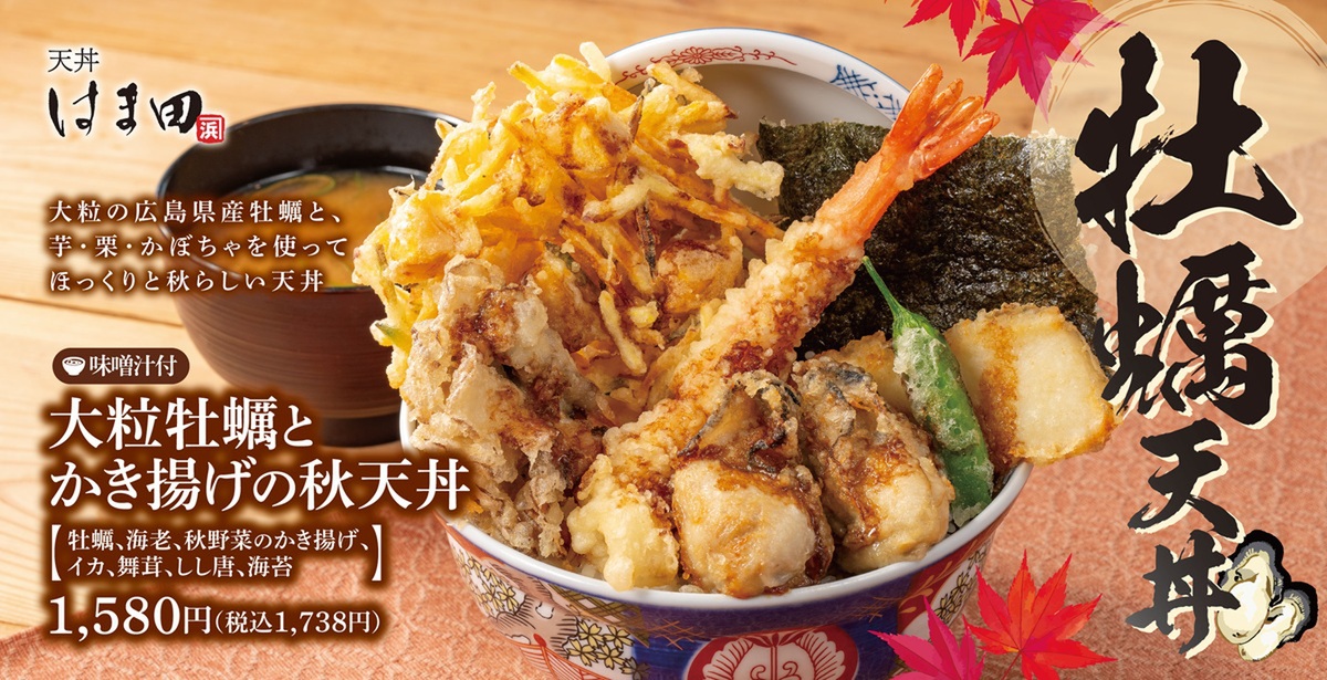 「天丼はま田」「天ぷらめしはま田」の計4店舗では、「大粒牡蠣とかき揚げの秋天丼」を本日9月17日から期間限定で販売開始します。