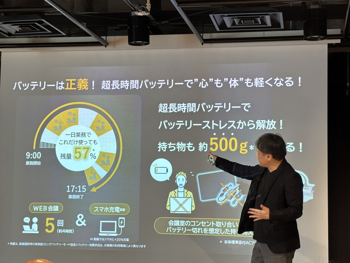 社内検証では、ウェブ会議5回(合計で約4時間)とPCによるスマホ充電、文書作成などの通常業務を8時間以上こなしても、約57%のバッテリー残量が確認されたという。