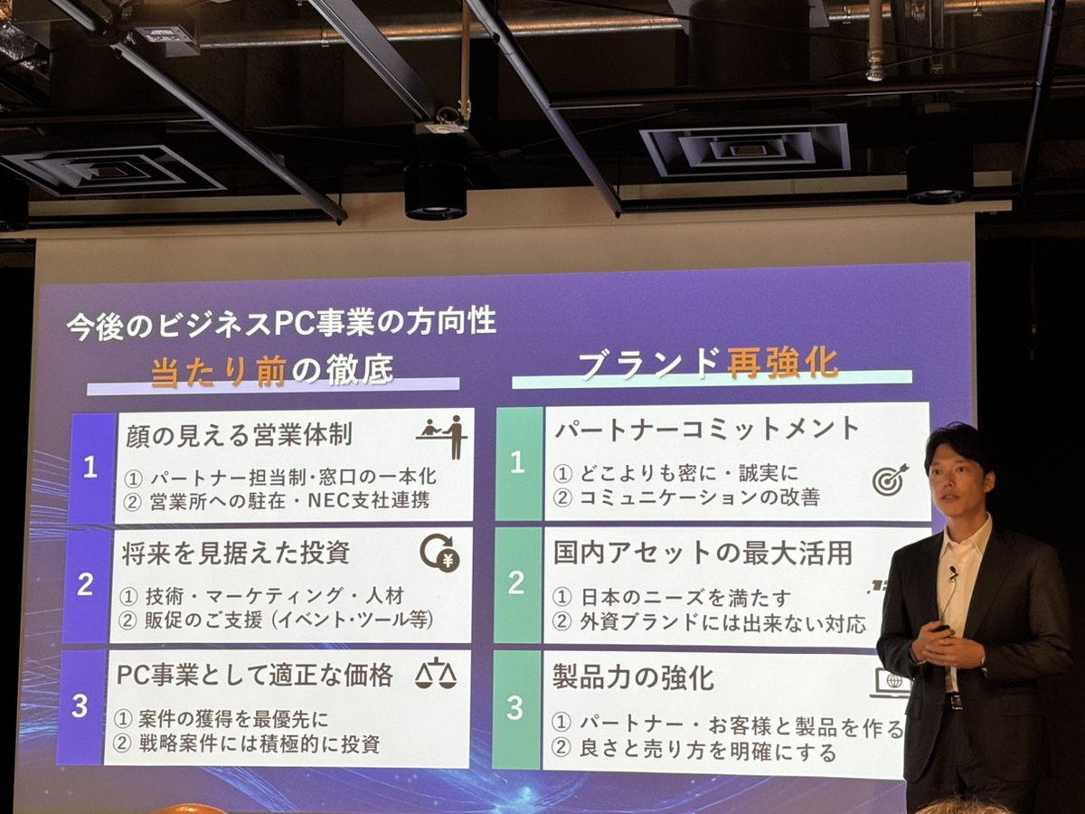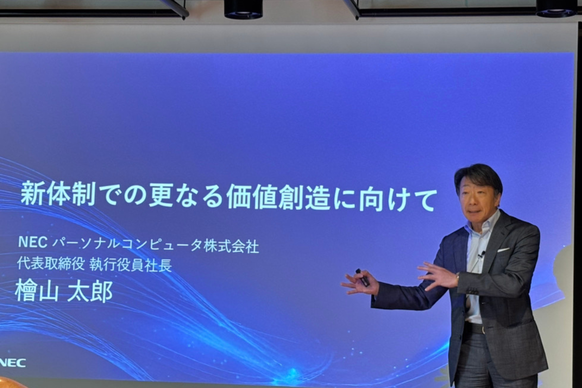 発表会ではNECPCの檜山社長らが登壇し、今年4月よりNECの法人向け営業部門がNECパーソナルコンピュータに合流し、調達から生産、設計、営業、マーケティング、サービス、サポートまで全て一元管理される新体制となったことを改めて説明。これにより、市場や顧客のニーズを迅速に製品開発に反映できるとしていた。