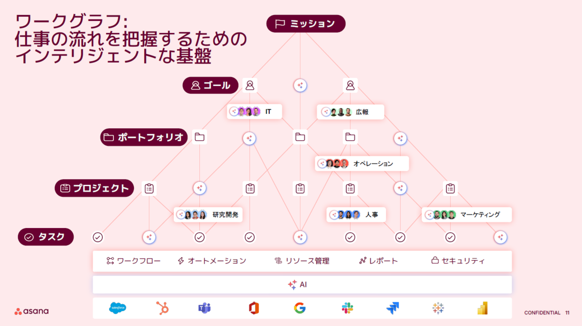 これに対してAsanaは、仕事の流れを把握するための「ワークグラフ」を基盤とし、上位のミッションから、ゴール、ポートフォリオ、プロジェクトという階層構造で、個人のタスクまで落とし込むことができる。また、Asanaはコンテンツやコミュニケーションツールをコーディネートする役割を持つ。立山氏は、「ツールは一部の人が使っても意味がない。多くの社員や外部の企業が利用できて、効果が出る」ということで、全社展開の重要性を説く。加えてAsanaは生成AIを組み込んだ機能をすでにいくつもリリース済み。昨年発表された「Asana AIスタジオ」では、コーディングなしでワークフローをAIに組み込めるほか、「スマートワークフローギャラリー」で業務ごとに構築済みのAIワークフローを活用できるという。