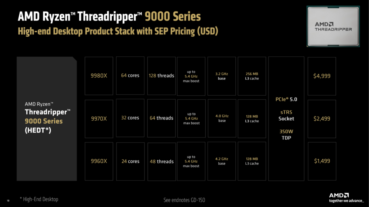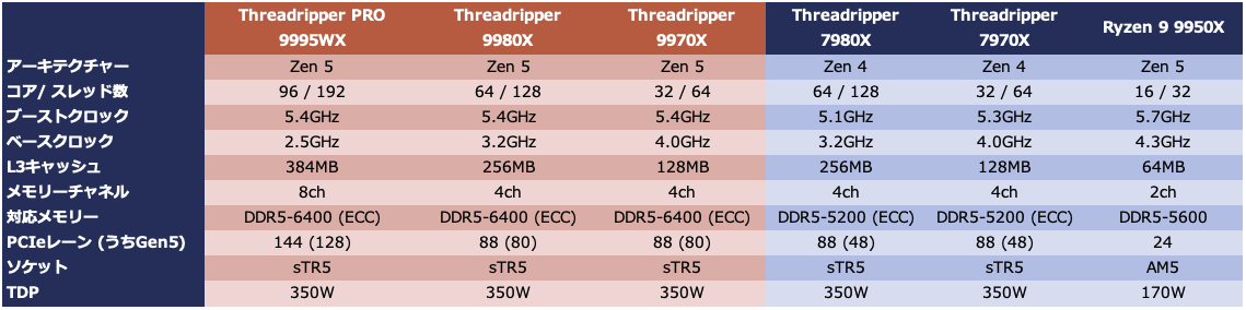 AMDのプロ/ HEDT(High-End-DeskTop)向けCPUである「Ryzen Threadripper」シリーズ(以降Ryzenは省略)が、いよいよZen 5世代に更新される。つい先日、プロ向けの「Threadripper PRO 9000 WX」シリーズが発表されたばかりだが、今度はHEDT向けの「Threadripper 9000」シリーズが発表された。ラインナップと北米予想価格は以下の通りである。
