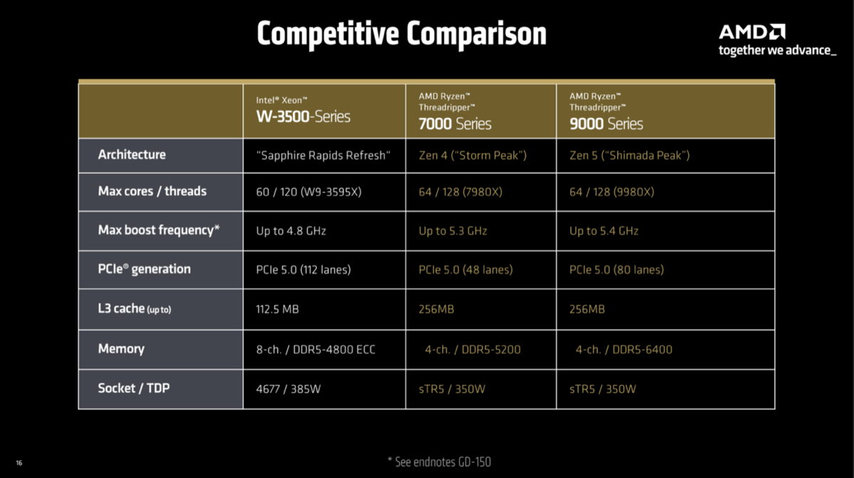 新旧ThreadripperおよびインテルのXeon W 3500シリーズの主なスペックを比較したもの。注目したいのは「PCIe Generation」と「Memory」だ。Threadripper 7000シリーズに対し、PCI Express Gen 5のレーン数と対応メモリークロックにおいて、Threadripper 9000シリーズが上回っている