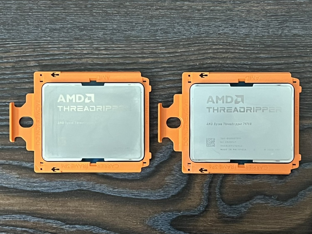Threadripper 9970X(左)と7970X(右)の比較。どちらもまったく同じ形状である。ソケットがsTR5を継承しているのだから当然といえば当然だ。ちなみにオレンジのキャリアプレートは非常にもろく、あっさりと割れるので取扱には注意されたい