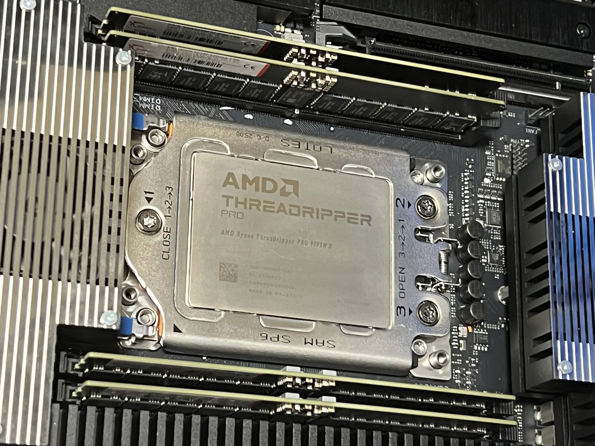 今回の評価キットに含まれていたASUS製TRX50マザー「Pro WS TRX50-SAGE WiFi」にThreadripper PRO 9995WXを装着。メモリースロットが4本しかないため、Threadripper PRO 9995WXのメモリー帯域は半分になる