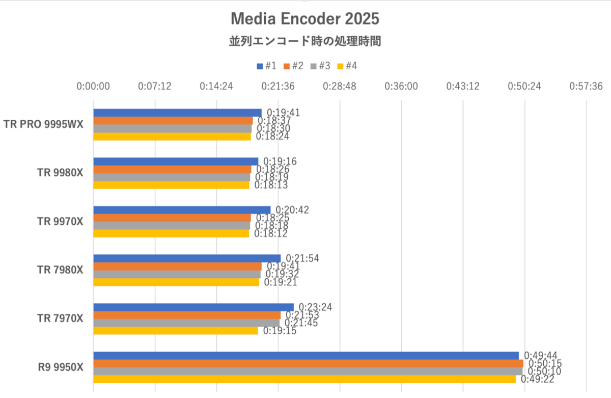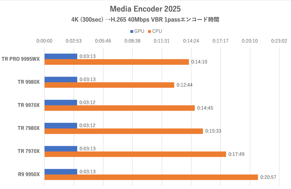 結果はHandBrake(Super HQ 1080p30 Surround)の傾向に似ている。Threadripper 9970Xがコア数の多いThreadripper 7980Xよりわずかに速いという下剋上も共通だ。ただGPUエンコードに比べるとCPUエンコードは壊滅的に不利である。