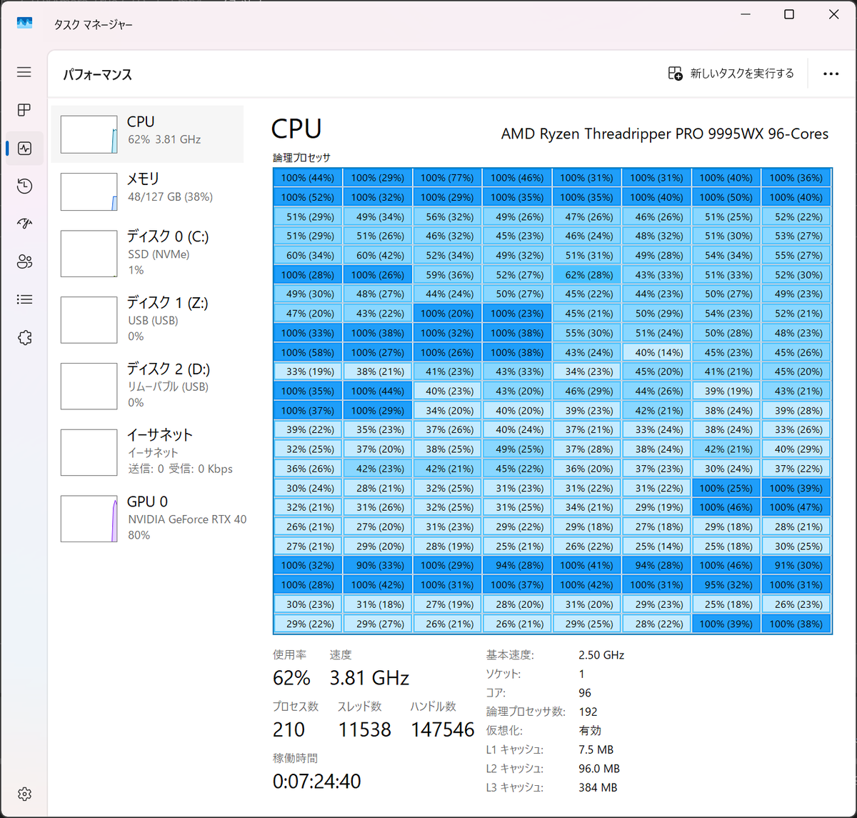 その点Threadripperはコア数もメモリー搭載量も優位にあるため、処理時間は単独処理よりやや長くなる程度だったが、コア数との関連づけられるような結果は得られなかった。期待のThreadripper PRO 9995WXですら、Threadripper 9980Xと大差ない結果に終わってしまったのだ。